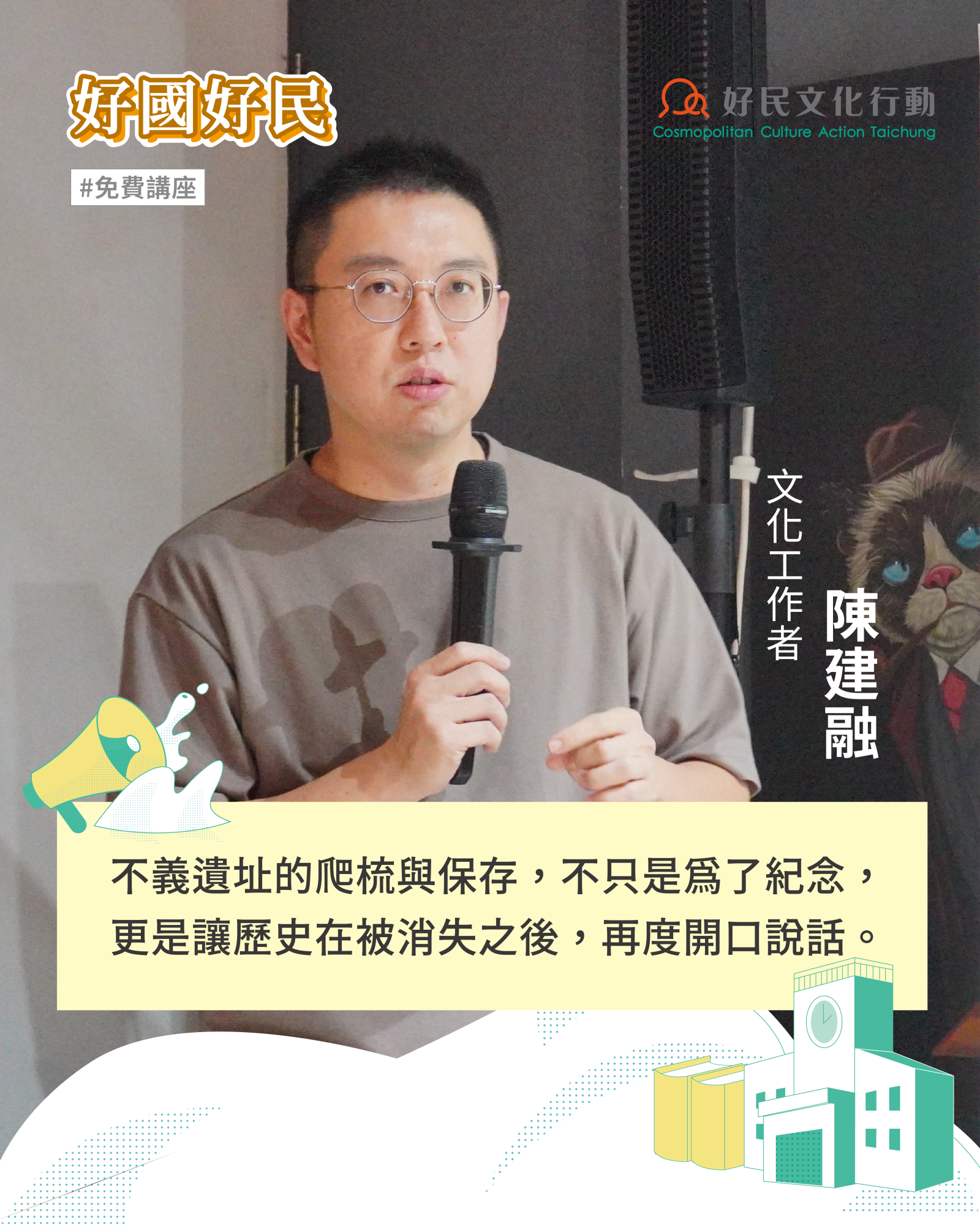 「許多不義遺址正在逐漸消失,如何讓這些建築成為轉型正義的成果,我們要從不義遺址出發,以積極的眼光,在錯誤中覺醒,化為團結的動能。」-文化工作者陳建融