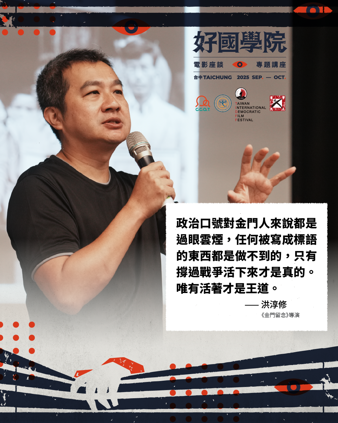 長期記錄金門人生活的洪淳修導演,也分享了自己對於金門人觀點的觀察。對台灣人來說,兩岸關係是文字上、訊息上的;但對金門來說,卻是真實在眼前發生的肉搏戰與死亡,就如同片中採訪到石成梅的老公說:「今天跟你玩的同學明天不見了,因為被炸死了」,金門位於與中共作戰的第一線,慘痛的經驗是台灣人無法想像的。