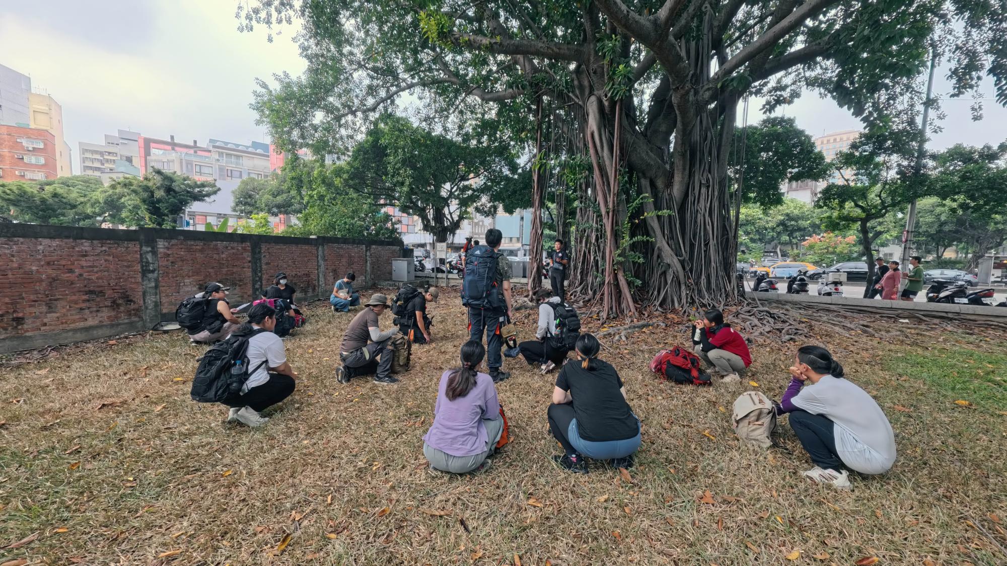 演練地點設在台中公園內。活動開始前,民團協會的工作人員先說明模擬情境與演練方式——他們會依序公布不同的災害狀況,例如空襲、地震或無人機襲擊,並要求我們即時反應。參與者被分成數組,每組四至五人,設定關係為「一家人」,因此各種狀況都會針對整組下達指令。每個情境結束後,會有檢討回顧時間,讓我們思考應變過程中有哪些不足,或是缺乏了哪些物資與技能。