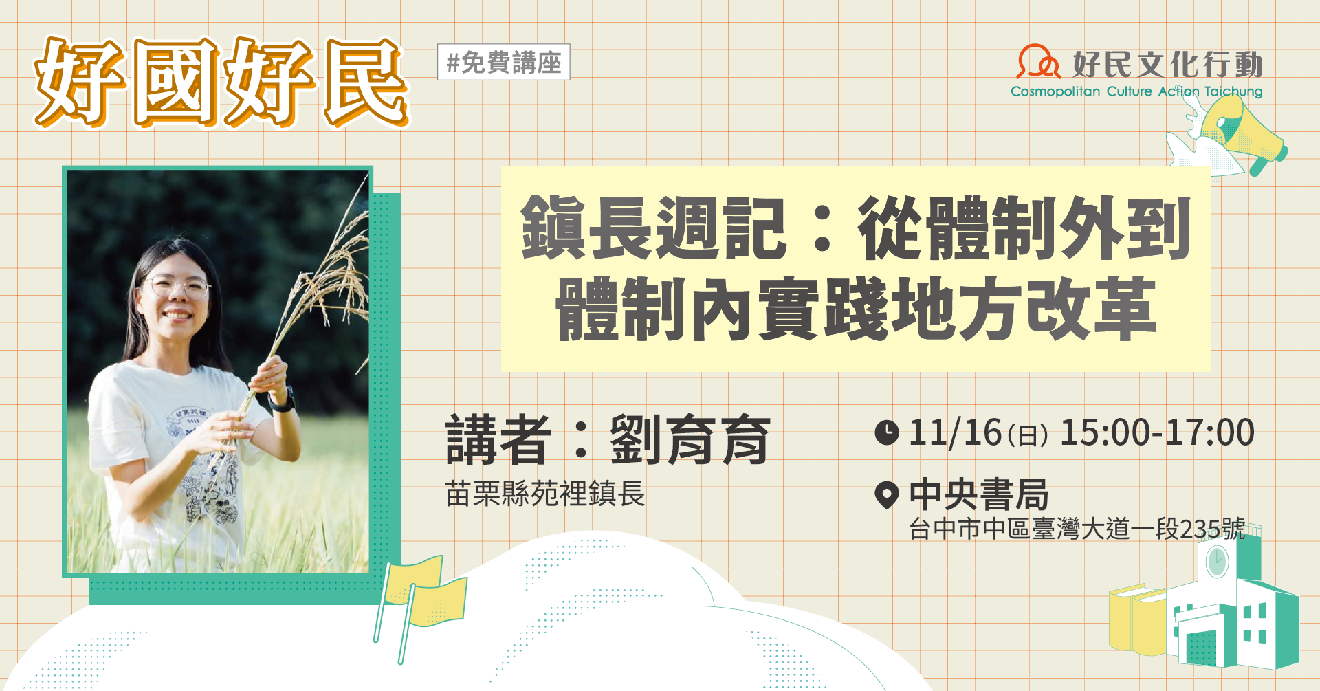 11/16,我們榮幸邀請到苗栗縣苑裡鎮長劉育育,分享她如何從體制外到體制內、在現實與理想之間,持續實踐地方的民主與希望。