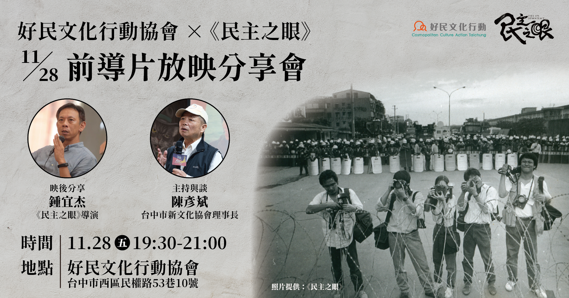 好民文化行動協會很高興與《民主之眼》合作舉辦前導片放映分享會,將邀請本片導演鍾宜杰進行映後分享,也邀請台中市新文化協會陳彥斌理事長擔任主持與談,一同回顧台灣走過的民主足跡。