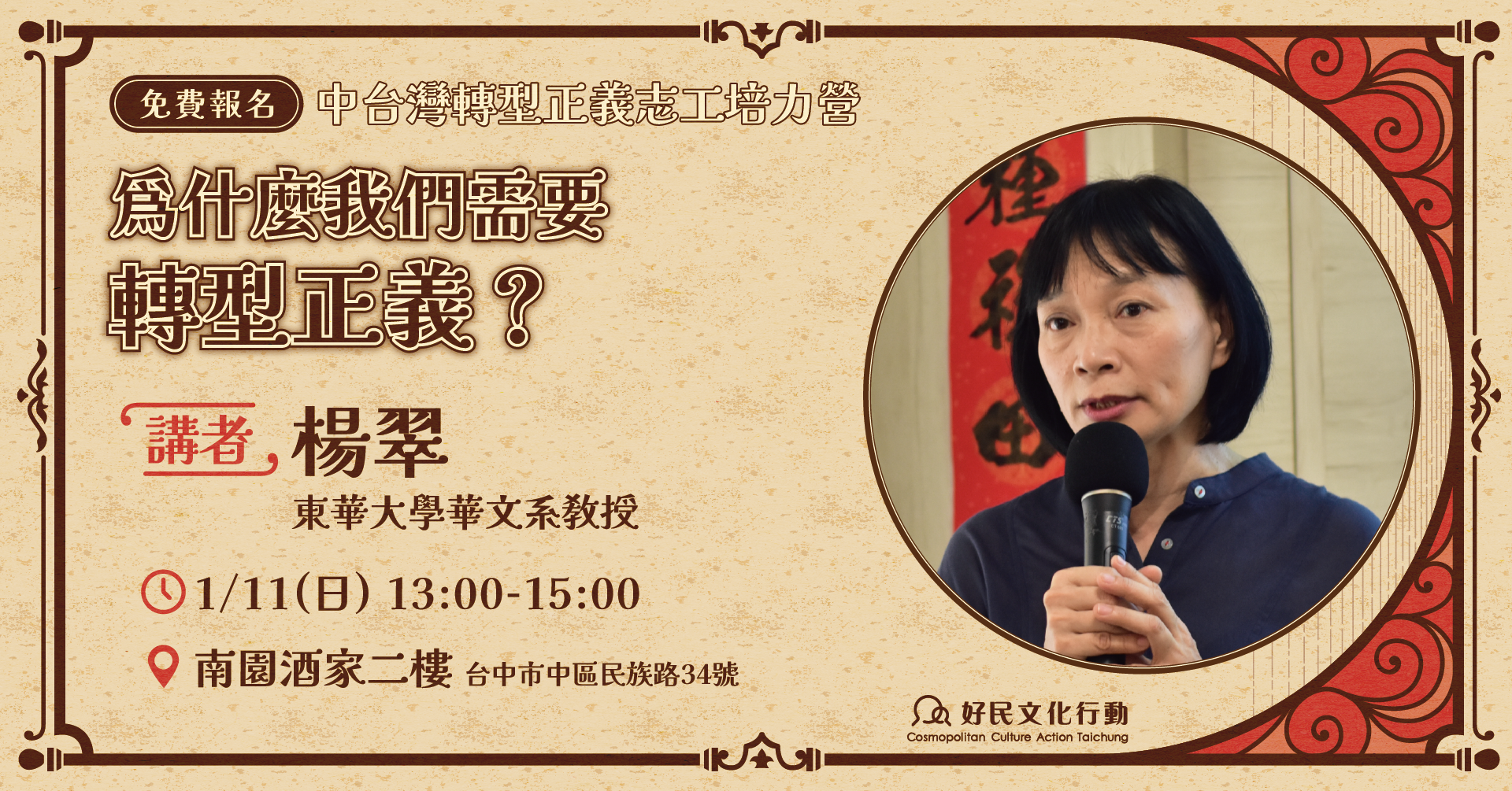 本場講座由東華大學華文系教授楊翠主講,將帶我們一起認識轉型正義的內涵是什麼,並探討為何台灣必須面對過去實行轉型正義。而轉型正義對受難者、家屬、乃至一般大眾而言有何重要意義。講座也將帶領大家思考:作為公民,我們能如何支持、倡議並促進轉型正義,讓社會走向更公平、更能彼此理解的未來。