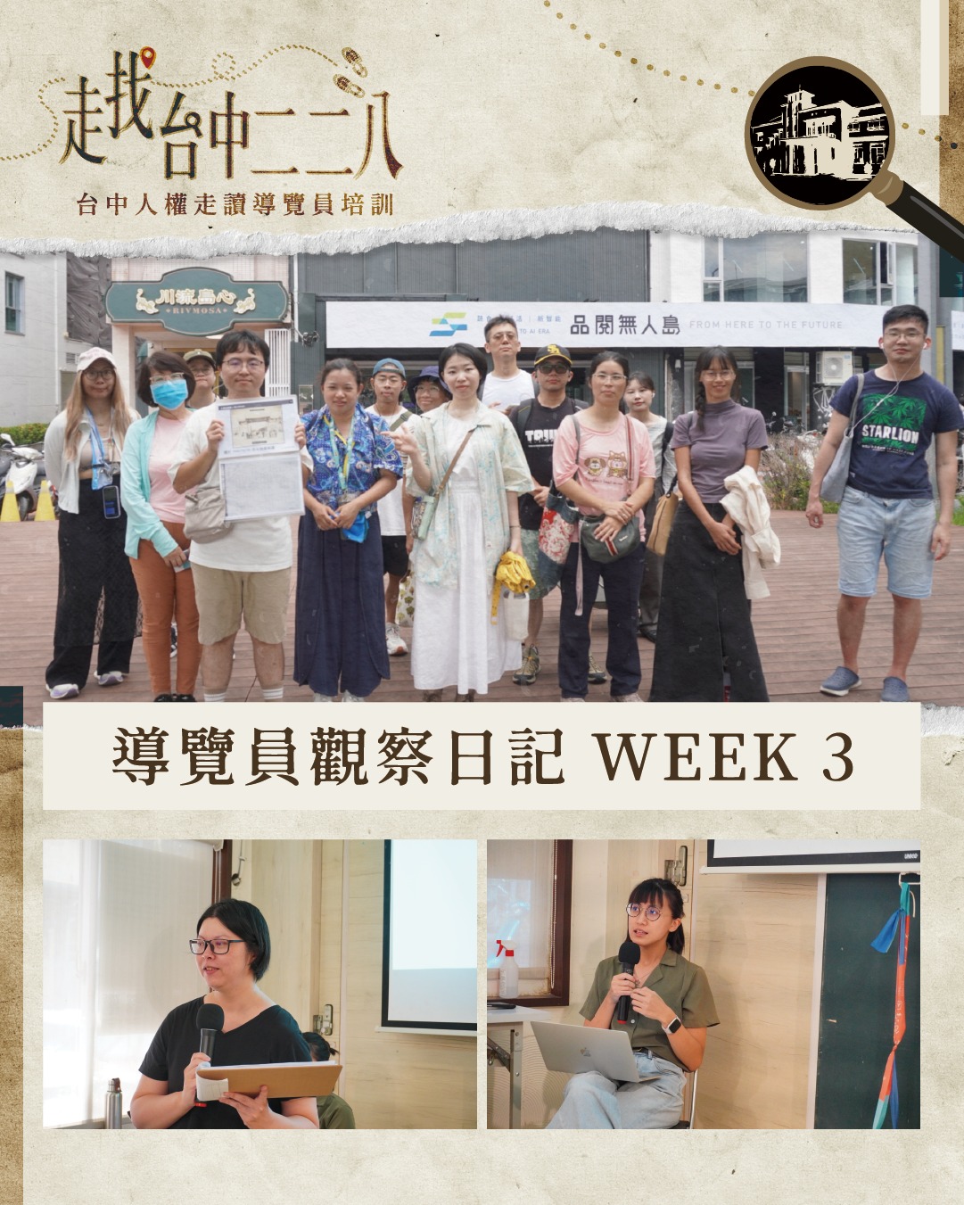 三週下來,課程已經讓我們逐步掌握歷史脈絡,也初步理解導覽需要具備的技巧與思維。第三週的實地走讀更是一次重要的實踐經驗,讓我們意識到導覽現場可能面臨的挑戰與需要克服的細節。下週便是成果驗收的時刻,期許自己能把這些學到的知識與方法融會貫通,嘗試將歷史故事以清晰而動人的方式傳達給觀眾。