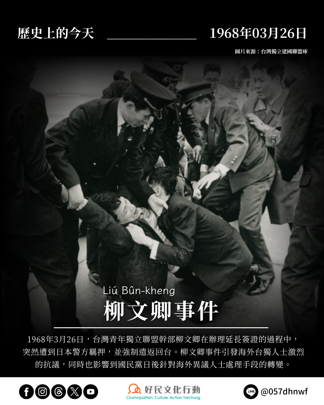 1968年3月26日,位在日本的台灣青年獨立聯盟 幹部柳文卿 Liú Bûn-kheng,因為辦理簽證到期手續,而前往日本入出國管理局處理延長簽證,沒想到他卻遭到日本警方的羈押,並且被告知將要把他遣返回台灣,這是因為當時中華民國政府要求已在台灣抓到的日本煙毒犯,跟日本交換海外的台獨人士。
