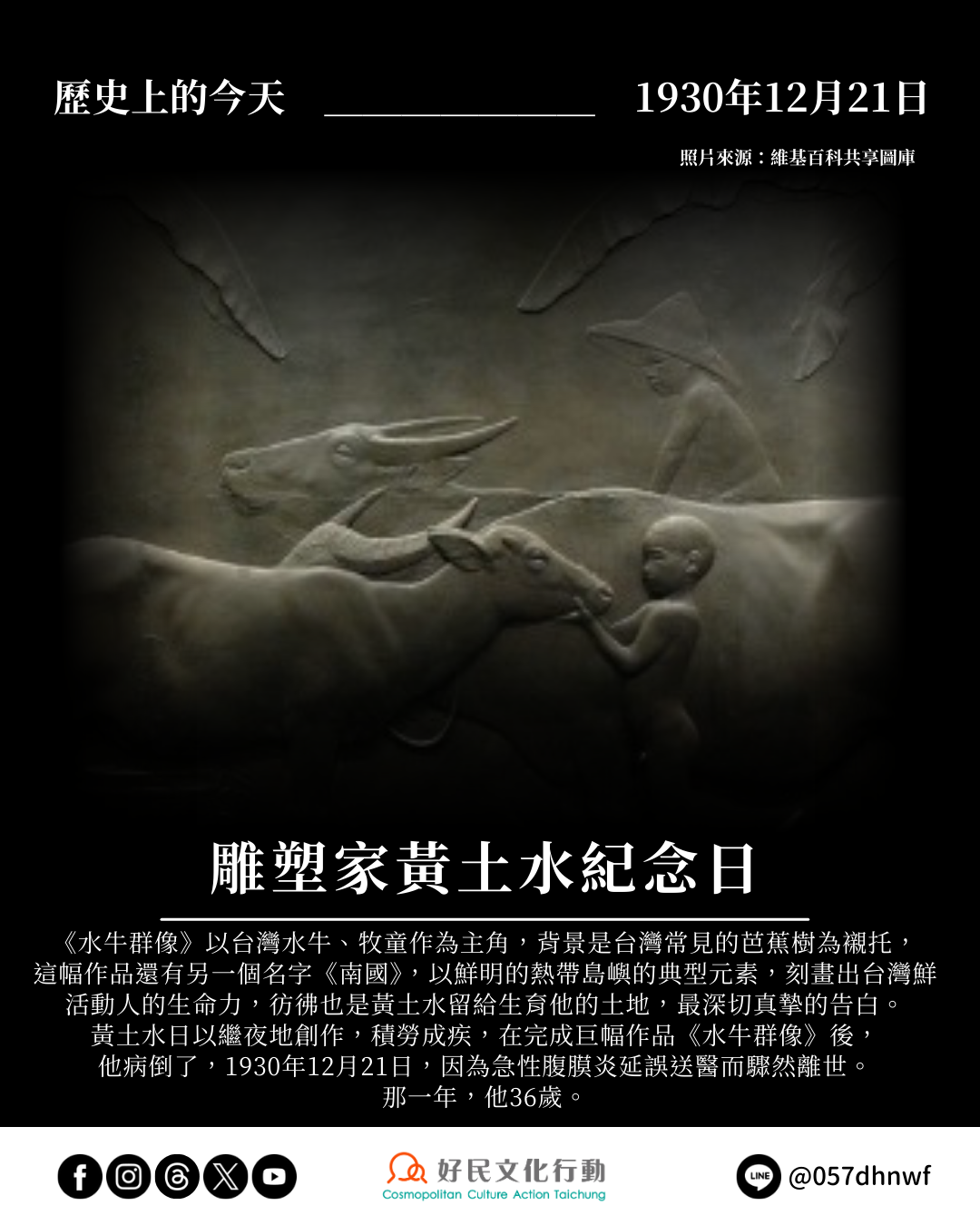 為此,黃土水可以說是日以繼夜地創作,然而也在這樣的過程當中,他積勞成疾。在完成巨幅作品《水牛群像》後,他病倒了,1930年12月21日,黃土水因為急性腹膜炎延誤送醫而驟然離世。