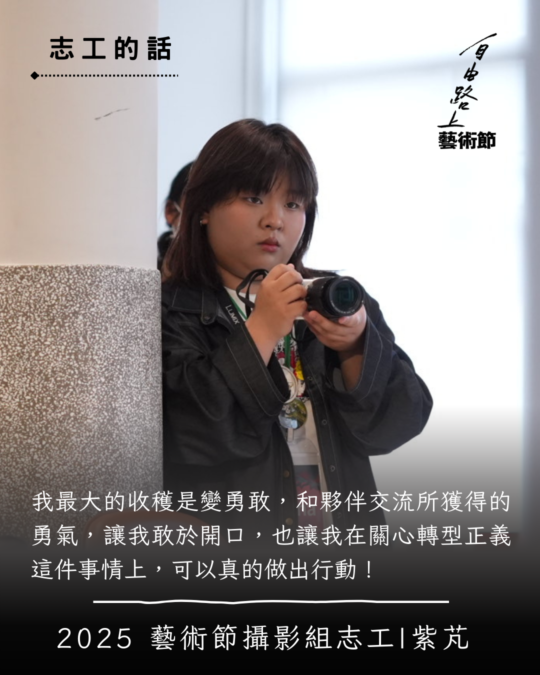 一開始會認識好民是因為2021年時在網路上看到自由路上藝術節的演出影片。2024年我開始關心社會議題之後,才第一次參加自由路上藝術節的活動。去年八月看到志工招募,就想說可以來試試看。