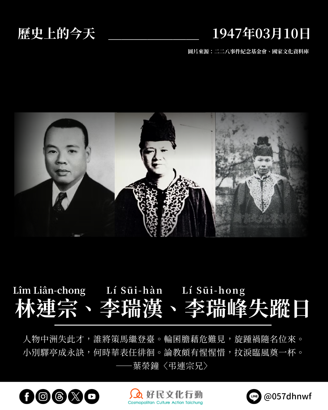 【歷史上的今天】三月做洪水——0310林連宗、李瑞漢、李瑞峰失蹤日
