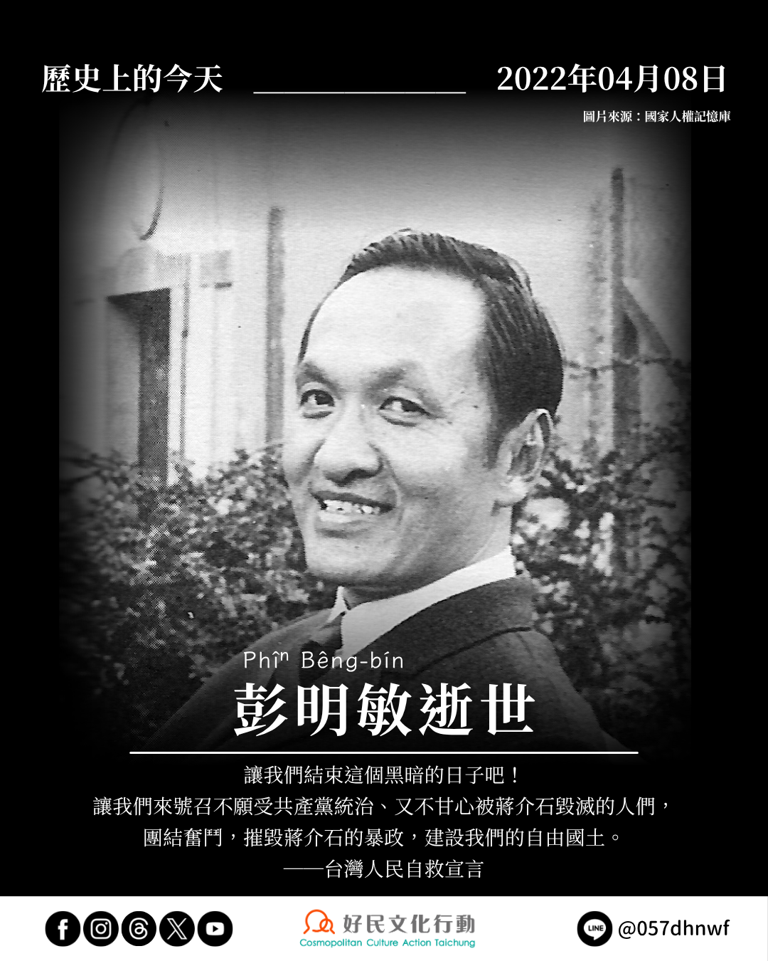 2022年4月8日清晨5時55分,彭明敏於和信治癌中心醫院逝世,享耆壽98歲。其一生為台灣民主奉獻良多,無懼於戒嚴黑暗,與謝聰敏和魏廷朝所擬之「台灣人民自救宣言」啟蒙海內外台灣人之意識,其行動也為台灣現今民主鋪下基石。