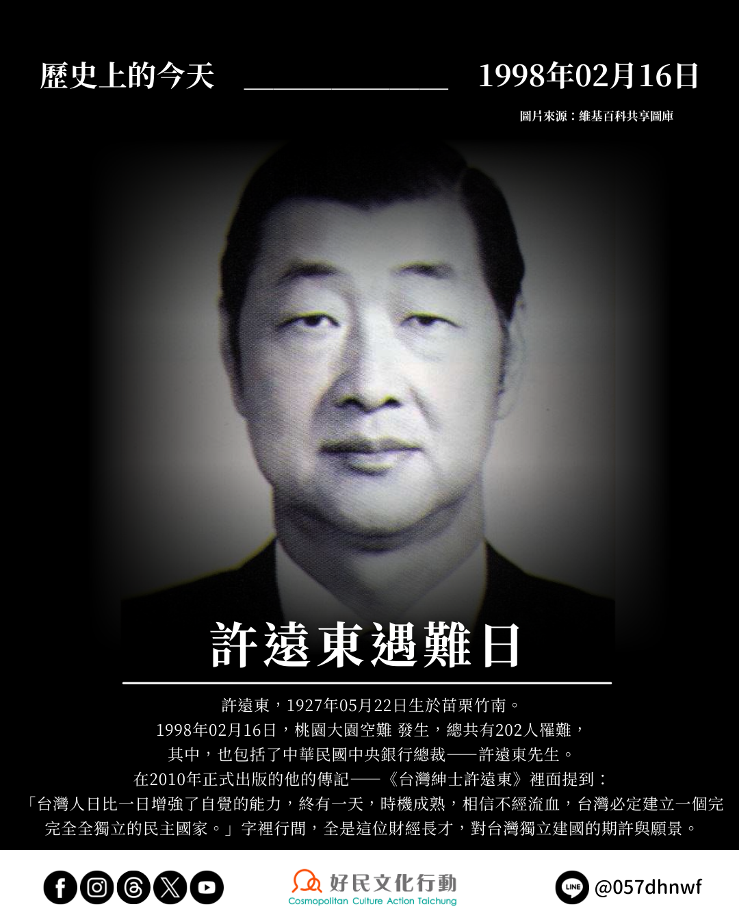 1998年02月16日,桃園大園空難發生,機上乘客、機組人員,以及地面上部分遭受波及的民眾,總共有202人罹難,其中,也包括了中華民國中央銀行總裁—— 許遠東先生,與他的妻子。