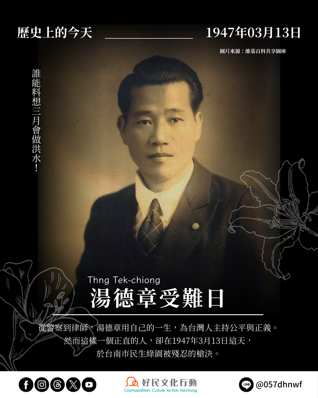 【歷史上的今天】三月做洪水——0313湯德章受難日
